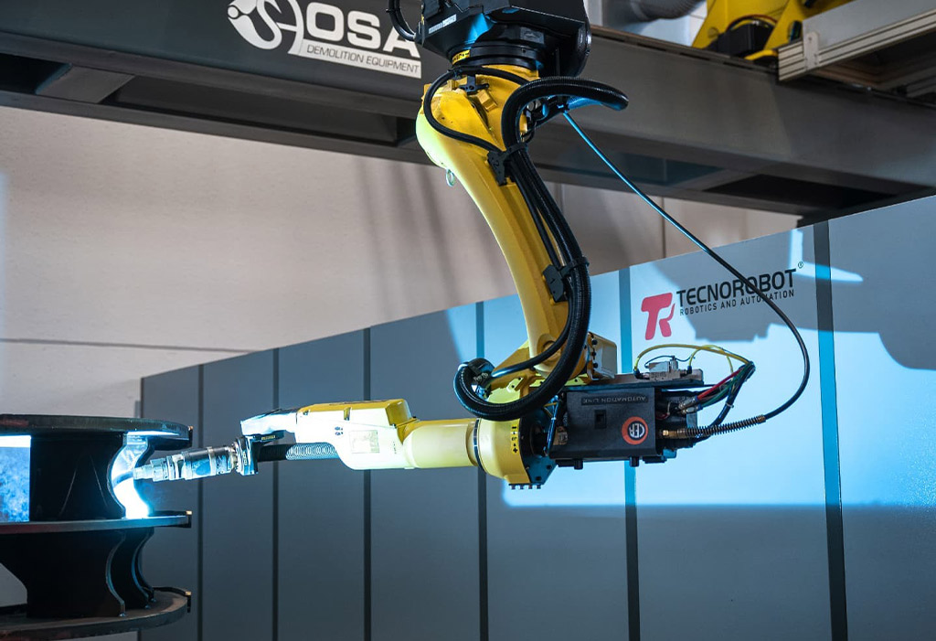Consapevole di questo, O.S.A. srl, azienda di Molfetta (Bari) che dal 1993 produce attrezzature da demolizione, ha chiesto a Tecnorobot di fornire una soluzione robotizzata per la saldatura e il taglio della lamiera che fosse in grado di migliorare la qualità dei propri prodotti e semplificare i processi produttivi, fino a quel momento affidati all’esperienza e competenza di operatori specializzati. Per rispondere a queste esigenze Tecnorobot ha progettato, sviluppato e costruito un impianto robotizzato di saldatura altamente personalizzato.