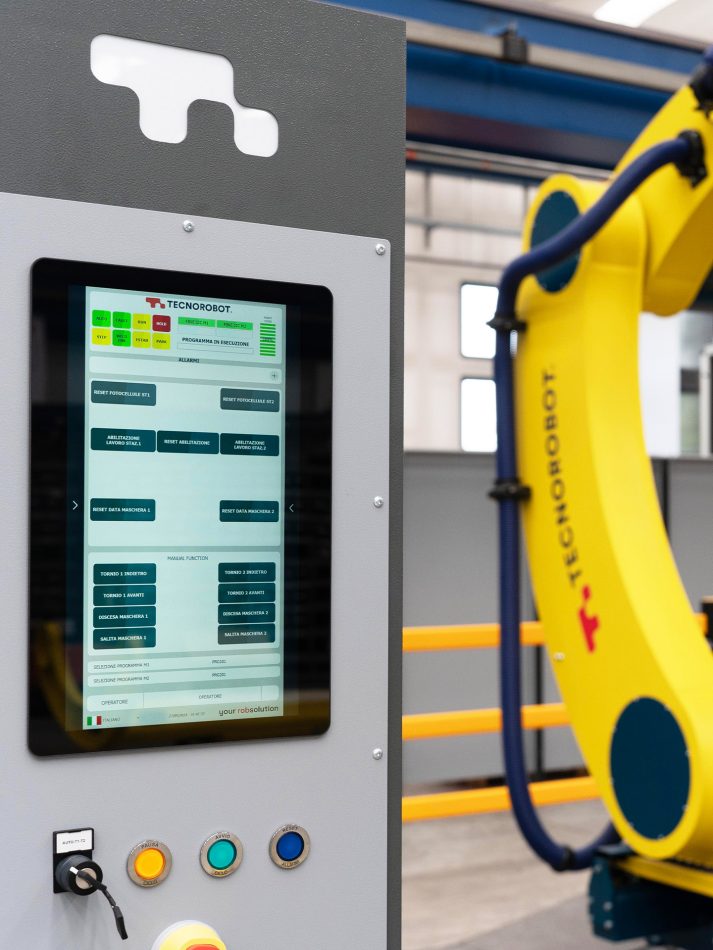 Il sistema Tecnorobot per Industry 4.0 rappresenta una soluzione avanzata per l'automazione industriale, dotata di un'interfaccia utente intuitiva attraverso un PC touch screen posizionato sulla colonna frontale dell'isola robotizzata.